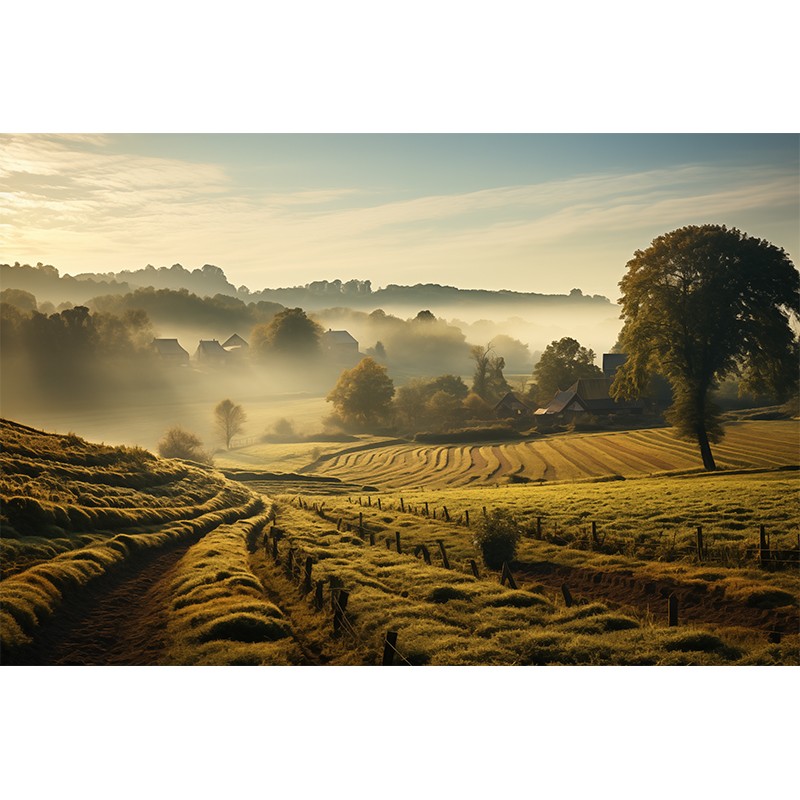 Prosto z Polski fototapeta wiejski krajobraz drukowana na zamówienie na materiale winylowym na fizelinie. Poranek na polskiej wsi z lekko zamglonymi budynkami i polem rolnym. Doskonały wybór, gdy szukasz fototapety krajobraz nawiązującej do klimatów polskiej wsi.