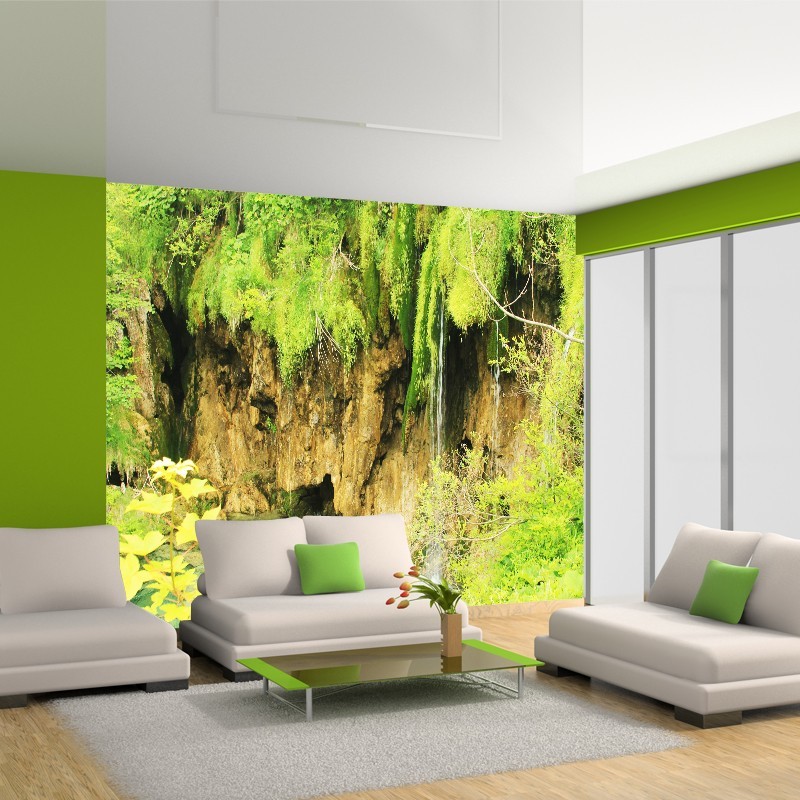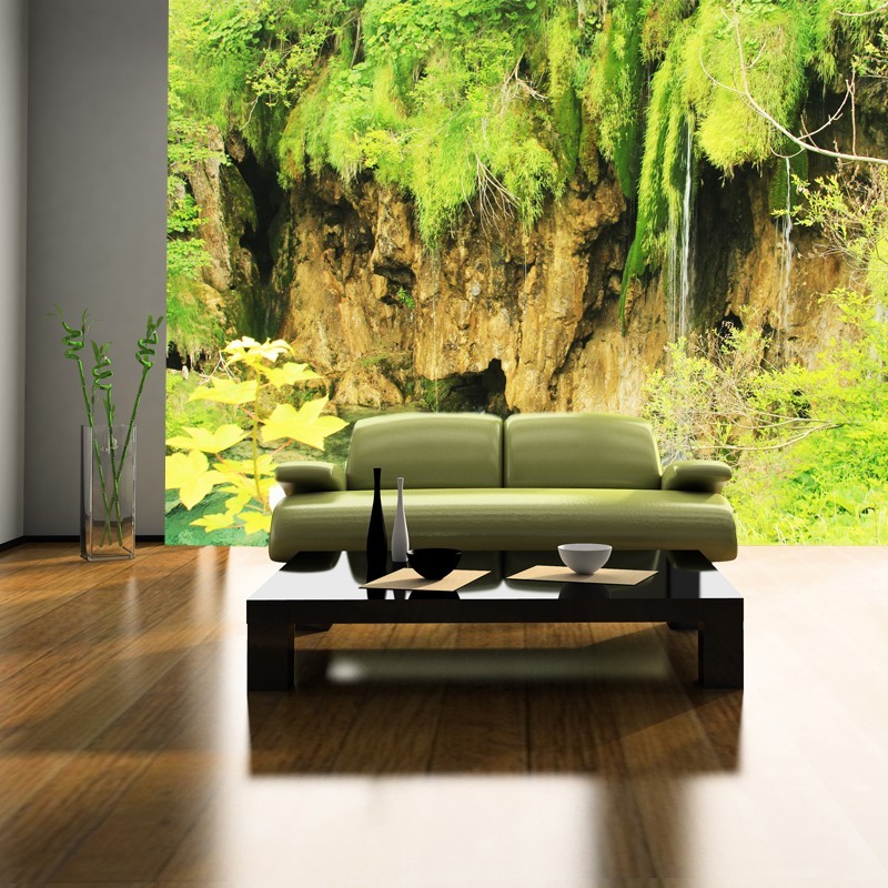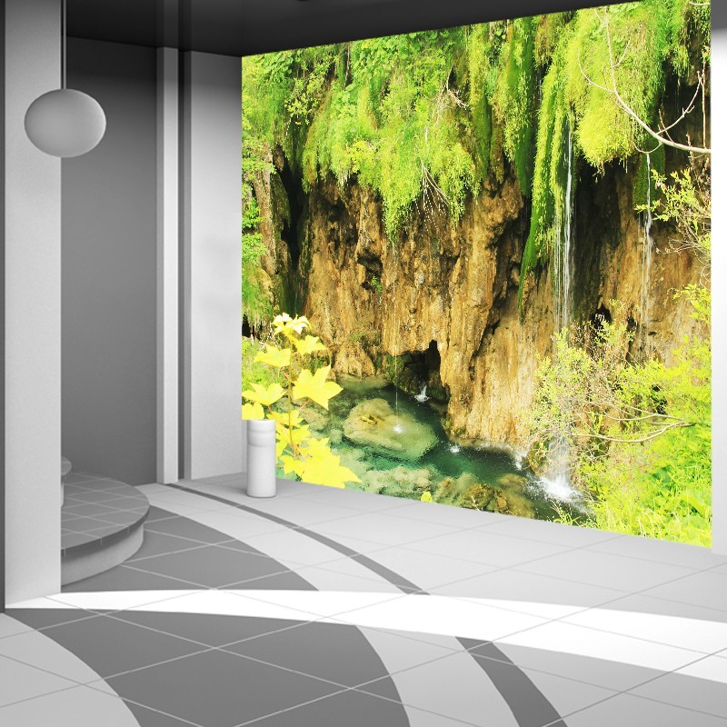 Ładna fototapeta z wodospadem na który spoglądasz od góry. Spływająca woda znika pod Twoimi stopami. Dekorację zamówisz na wymiar ściany.