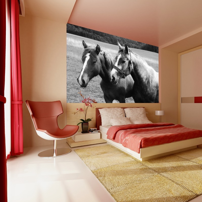 Piękna, chwytająca za serce fototapeta przedstawiająca dwa konie na łące. Utrzymana w czerni i bieli dekoracja doskonale sprawdzi się w salonie bądź sypialni nie tylko miłośników zwierząt. Wzór niezwykle klimatyczny.