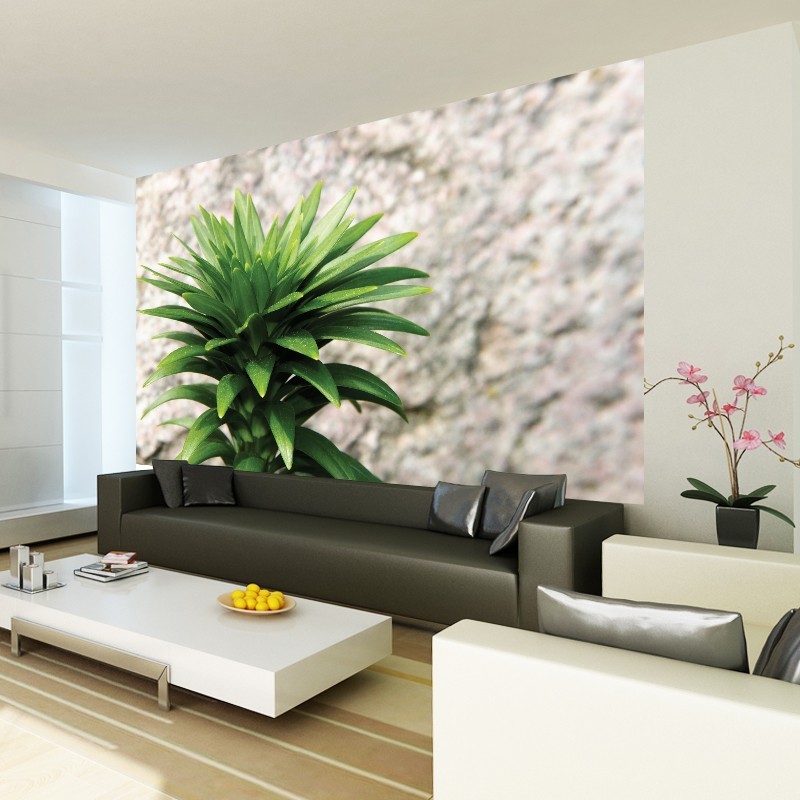 Fototapeta z zielonym kwiatkiem na tle beżowej ściany. Ostrość uchwycona na kwiatuszku - ściana z nim rozmyta. Fototapeta do zastosowania w salonie lub kuchni.