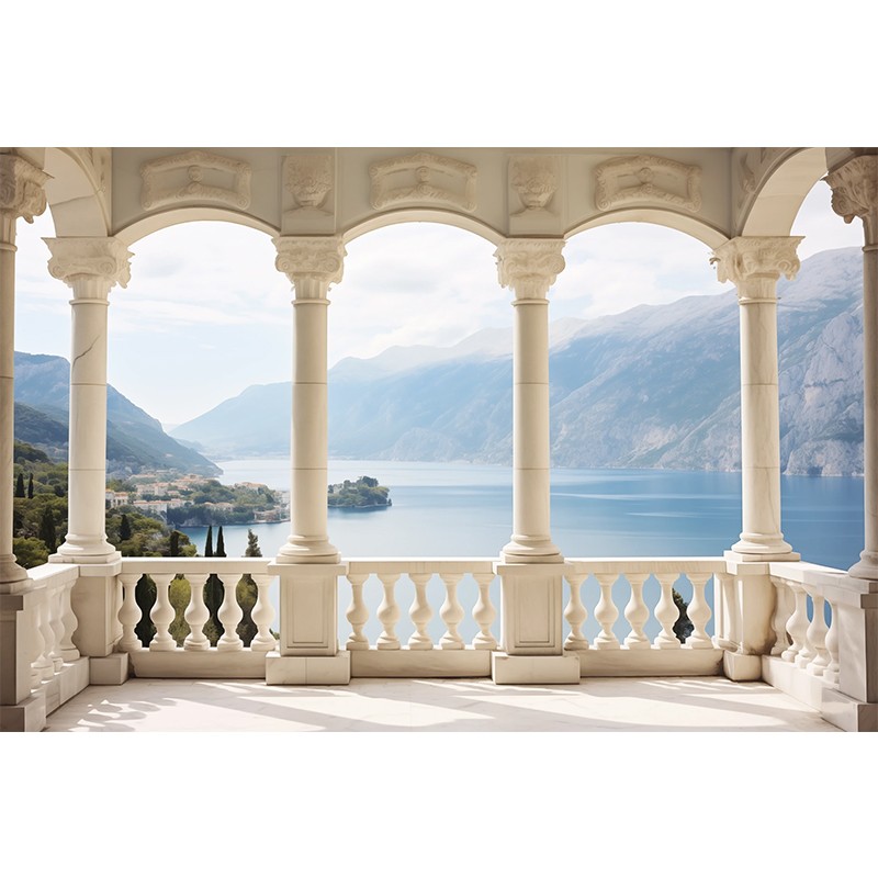 Piękna fototapeta kolumny na tarasie z widokiem na jezioro Garda we Włoszech. Antyczne kolumny otaczające kamienny taras dodadzą wnętrzu klasycznego stylu. Zapierający dech w piersiach widok z tarasu uzupełnia dekorację o przestrzeń i głębię. Poczuj klimat włoskiego krajobrazu.