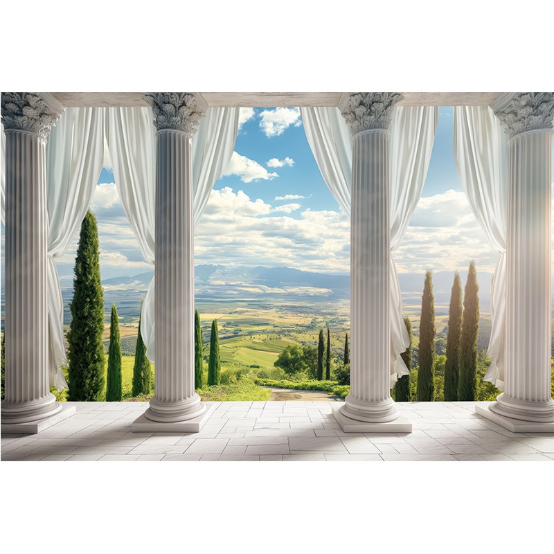 Wspaniała fototapeta z kolumnadą i widokiem na włoski krajobraz. Piękna dekoracja, którą optycznie powiększysz salon lub sypialnię. Zwiewne zasłony dodają lekkości kolumnom i poprawiają kompozycję. Fototapeta winylowa na fizelinie, którą zamówisz na wymiar ściany.