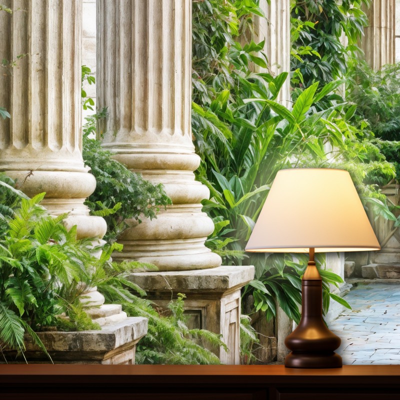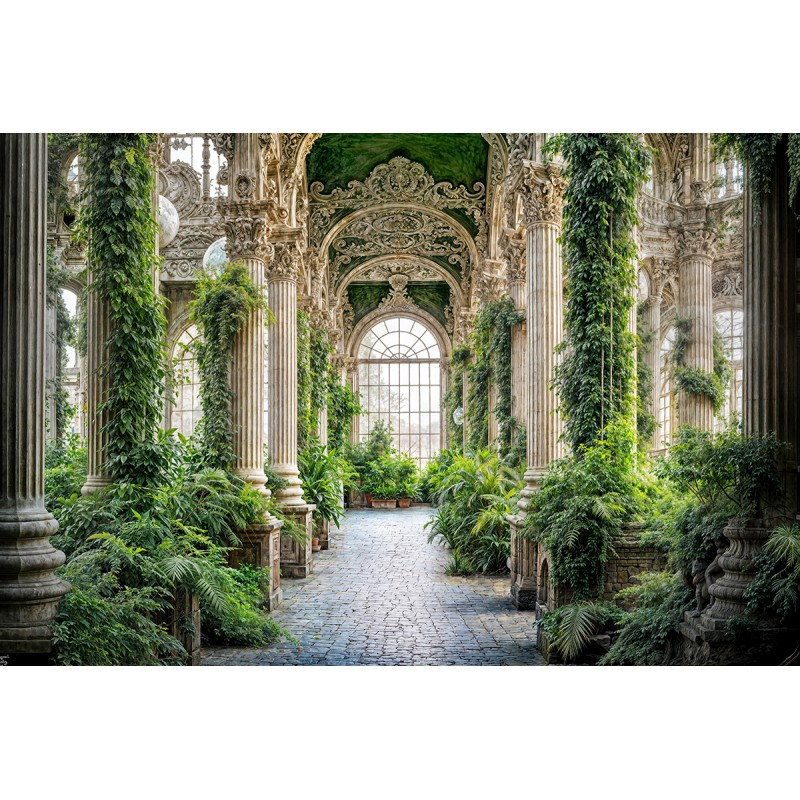 Ekskluzywna fototapeta "Zielona Kolumnada w Oranżerii" to idealny wybór do eleganckich wnętrz poszukujących klasycznego piękna. Salon, gabinet czy biblioteka zyska wyrafinowanego charakteru i świeżości. Monumentalne, klasyczne kolumny ozdobione bujną, zieloną roślinnością, tworzą atmosferę luksusowego ogrodu botanicznego. Wyjątkowe detale architektoniczne w stylu neoklasycznym – ozdobne łuki, rzeźbienia i ornamenty – podkreślają ekskluzywność i ponadczasowy urok fototapety kolumny z kolekcji Agaton Studio.