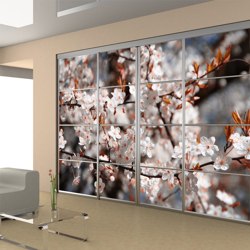 Naklejka lub fototapeta dedykowna do dekoracji szafy wnękowej. Gałązka z drobnymi kwiatami szczególnie dedykowana jest do szaf wnękowych w małych pomieszczeniach. Kwiaty nie przytłoczą dekorując jednocześnie wnętrze.
