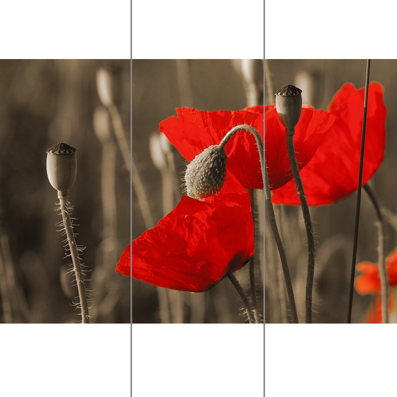 Naklejka lub fototapeta dedykowna do dekoracji szafy wnękowej. Kilka delikatnych, czerwonych kwiatów maku na tle łąki wykonanej w odcieniach brązu - sepii. Dekoracja na szafę trzy drzwiową można zamówić tylko jeden panel na jedne drzwi.