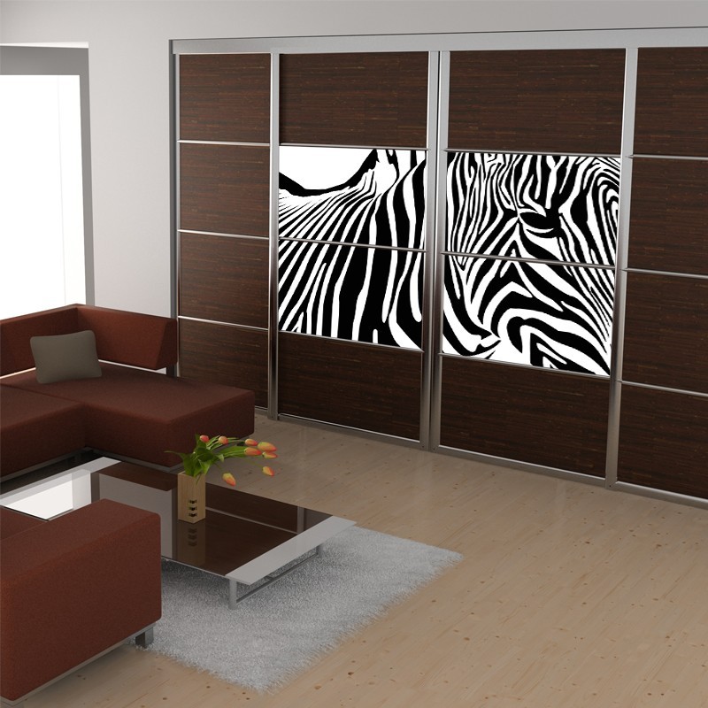 Naklejka lub fototapeta dedykowana do dekoracji szafy wnękowej. Niesamowita grafika przedstawiająca zebrę. Kolorystyka czarno biała sprawia, że naklejka lub fototapeta idealnie zaadoptuje się do wnętrza w każdej kolorystyce.