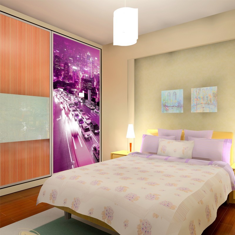 Naklejka lub fototapeta dedykowana do dekoracji szafy wnękowej. Pojedynczy panel, którym można urozmaicić środkowe drzwi w trzydrzwiowej szafie wnękowej. Wzór w odcieniach różu przedstawiający zakorkowane ulice miasta.