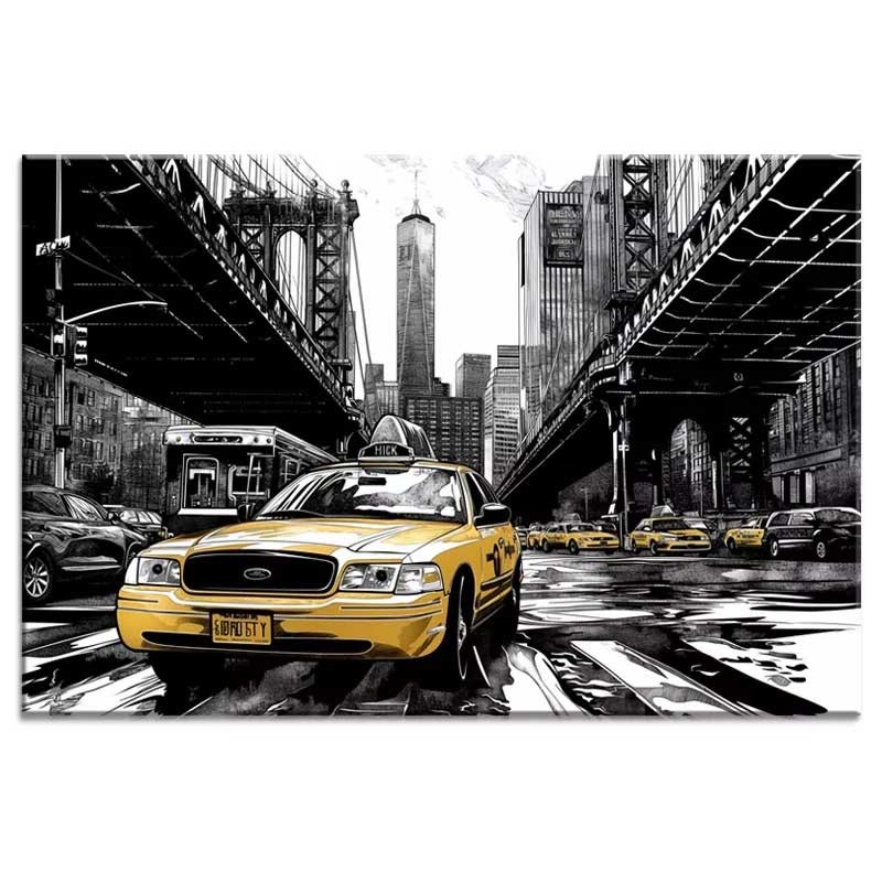 Naklejka lub fototapeta na szafę wnękową z graficznym widokiem Na Nowy Jork. Dynamiczna ozdoba ściany z żółtą taksówką i perspektywą mostów zamkniętą wieżowcami.
