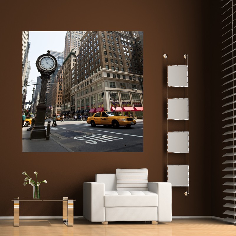 Fototapeta z ulicą miasta New York. Żółta taksówka - najpopularniejszy środek transportu w ruchliwym i zabieganym mieście. Dynamiczna dekoracja ścienna.