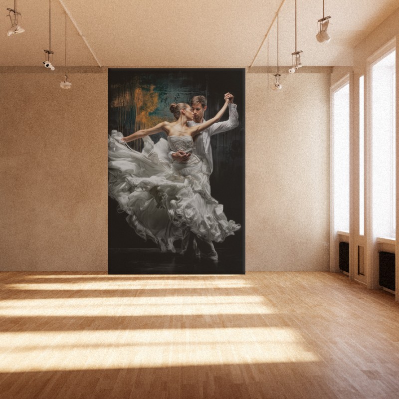 Przenieś na ścianę lekkość i elegancję ruchu, który wstrzymuje oddech. Para wiruje w półcieniu, a suknia rozlewa się jak fala światła. Całość buduje elegancję i spokój, a jednocześnie wprowadza dynamikę.