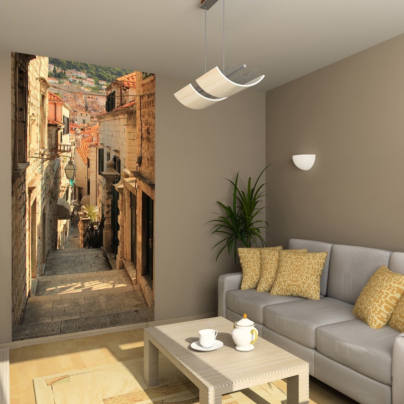 Subtelne kolory, lekka, przyjemna dla oka, to tylko kilka zalet tej dekoracji. Fototapeta uliczka z architekturą kamienic połączonych licznymi schodami. Głębia wzory optycznie powiększy przestrzeń Twojego salonu. Dekoracja która może zdobić drzwi szafy lub ścianę.