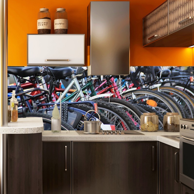 Fototapeta w panoramie z ujęciem szeregowo poustawianych rowerów. Rower to najpopularniejszy środek lokomocji młodych ludzi, studentów. Dekoracja z kategorii - motoryzacja.