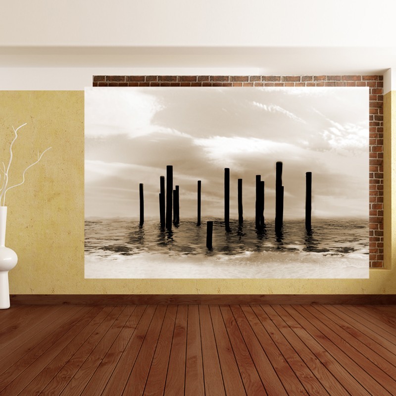 Fototapeta z morzem w stonowanych kolorach. Rozkołysane fale delikatnie obijające sie o drewniane pale. Kojący szum wody, bezchmurne niebo, zapach drewna - wszystko to może ozdobić ściane w Twoim salonie.