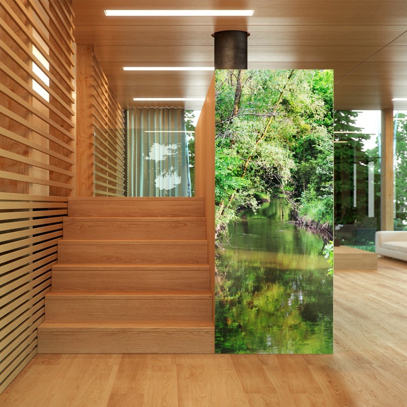 Fototapeta z drzewami rosnącymi wzdłuż niewielkiej rzeki. Dzika natura, niezdobyta, w pełnej okazałości. Zieleń dominująca w tej dekoracji dobrze komponuje się z białą ścianą w przedpokoju. Do tego typu pomieszczeń polecamy fototapety laminowane.