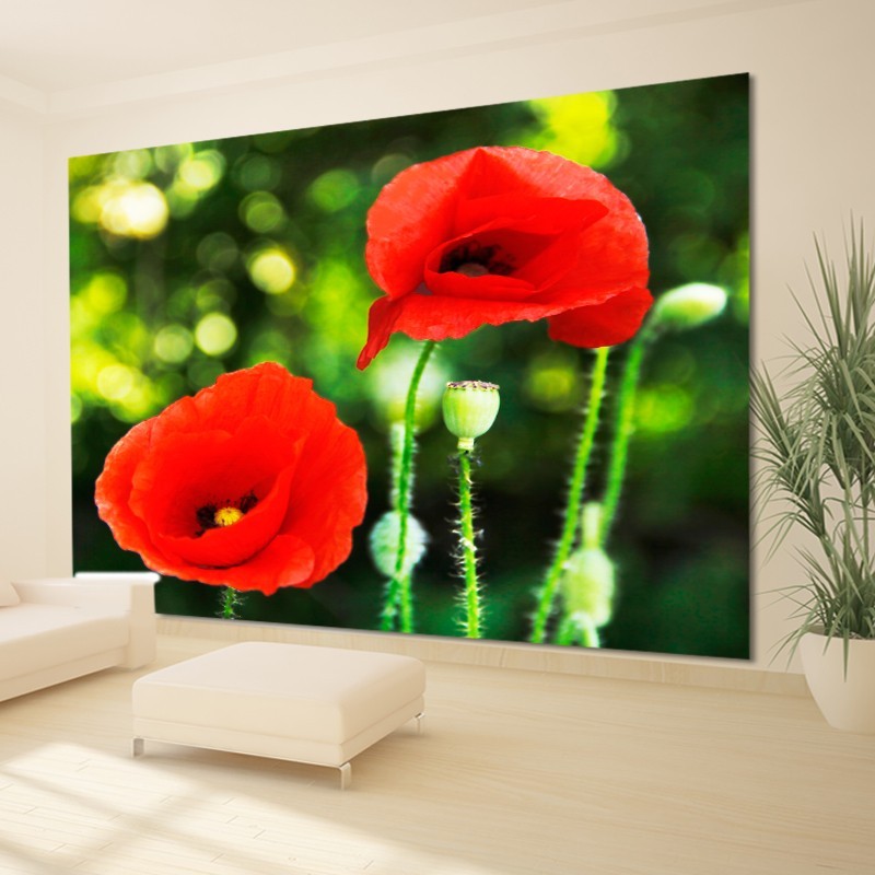 Intensywna czerwień na tle soczystej zieleni. Fototapeta z modelem maków na tle zielonej łąki. Dekoracja w mocnej kolorystyce będzie wyraźnie prezentować się na każdej ścianie. Zamów na wymiar ściany.