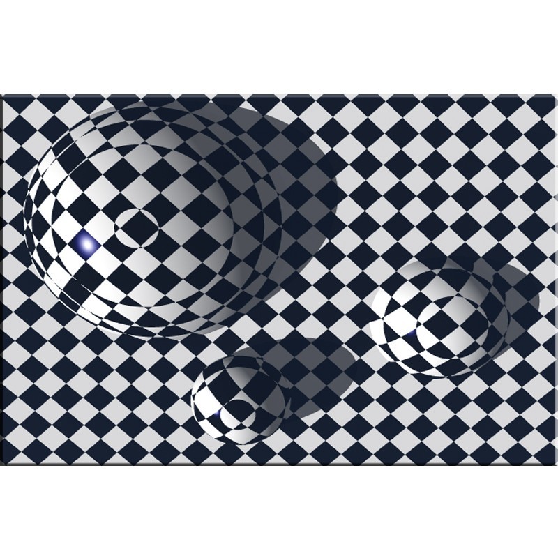 Obraz z nowoczesnym wzorem przedstawiającym kwadratową posadzką w na przemian bieli i czerni, dodatkowymi elementami są trzy różnej wielkości kule całe również jakby okryte kształtami i barwami z wcześniej wspomnianej tekstury. Taka dekoracja doskonale nadaje się do ozdobienia przedpokoju, gdzie jej atuty będą najlepiej widoczne. Więcej takich wspaniałych wzorów znaleźć można w kategorii abstrakcja.