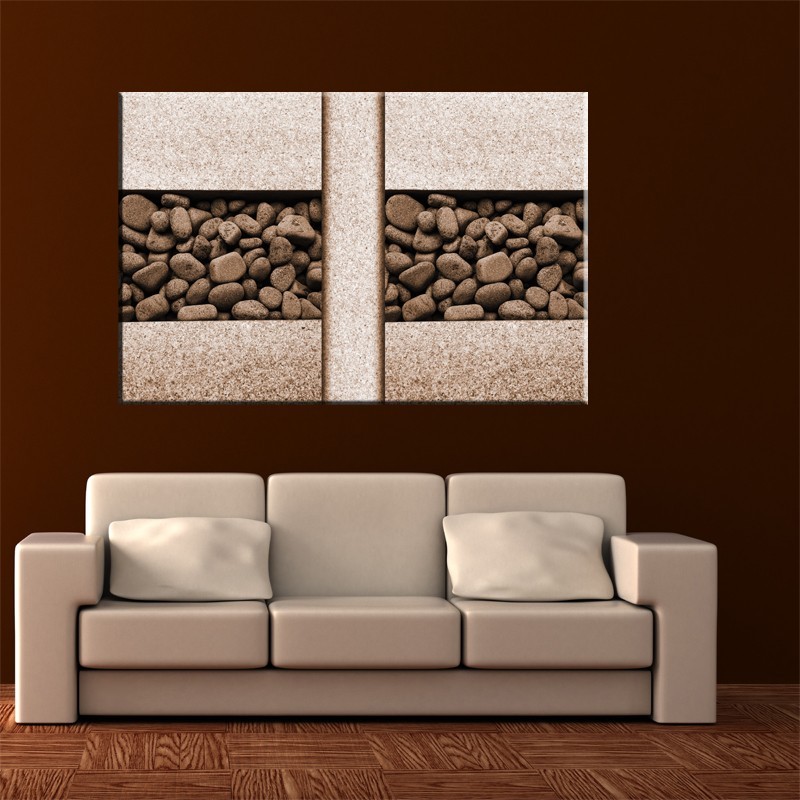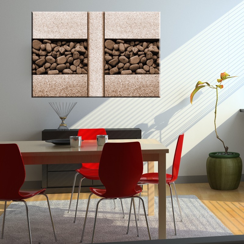 Obrazy z kamykami ułożonymi w można powiedzieć szczelinie między dwoma gigantycznymi blokami granitu. Jest to dzieło z niezwykle mocnymi korzeniami w stylu abstrakcyjnym, które wprowadzają do wnętrza niepowtarzalną atmosferę kojarzoną doskonale z galeriami sztuki nowoczesnej. Taka dekoracja doskonale nadaje się do ozdobienia wnętrza przedpokoju, gdzie jej pozytywny wpływ będzie największy. Więcej takich dekoracji znaleźć można w kategorii abstrakcje.