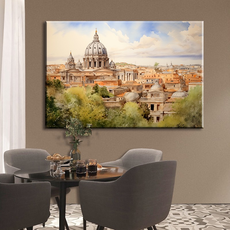 Reprodukcja malarstwa akwareli jako drukowany obraz na płótnie z motywem Rzymu widzianego z góry. Głównym elementem jest kopuła Bazyliki Św. Piotra. Imponująca perspektywa i piękne pastelowe kolory, to niewątpliwe atutu jakie oferuje obraz Rzym w akwareli na wyjątkowej reprodukcji od Agaton Studio.