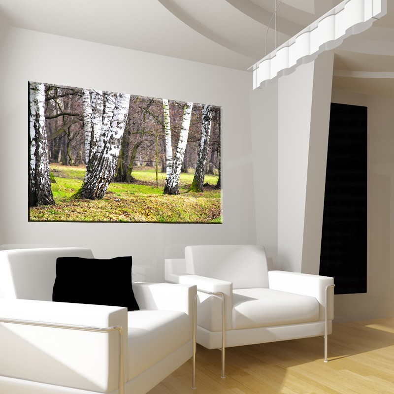 Obraz z brzozami niewzruszenie rosnącymi w słonecznym parku, zielona trawa poprzetykana jest plamami pożółkłych kępek i liści wskazujących na zbliżającą się wielkimi krokami zimę. Jesień, taką właśnie porę roku przedstawia ten wzór, robi to jednak w inny niż zwykle sposób, ukazując jej kolorowe oblicze, które wprowadzi do wnętrza pozytywną i spokojną atmosferę. W dziale fototapet znaleźć można kategorię drzewa z podobnymi wzorami.