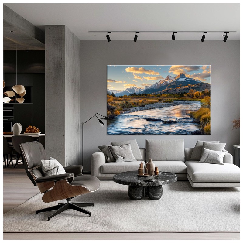 W sercu nieskazitelnej przyrody narodził się obraz "Rzeka w Górach". Ujmujący pejzaż, ukazujący krystalicznie czystą wodę płynącą przez dziką dolinę. Majestatyczne góry prezentuje nasz obraz krajobraz przyciągając wzrok i kojąc zmysły. Złote światło zachodzącego słońca odbijając się od szczytów dodaje ciepła i głębi kompozycji.