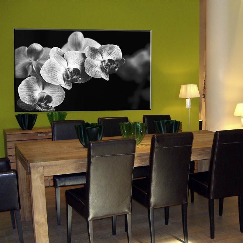 Obraz z orchideą pogrążoną w odcieniach czerni i bieli która w niezwykły sposób jeszcze bardziej zwiększa jej wspaniały wygląd. Ponad to dzięki mocnemu zbliżeniu można przyjrzeć się wszystkim nawet najdrobniejszym szczegółom., takim jak żyłki biegnące wzdłuż płatków, czy plamki na w centrum kwiatu. Taka dekoracja doskonale pasuje do ozdobienia salonu gdzie wprowadzi nieco delikatności i spokoju. Jeśli jednak ten wzór ni pasuje w połączeniu z obrazem, zawsze można użyć go na fototapecie.