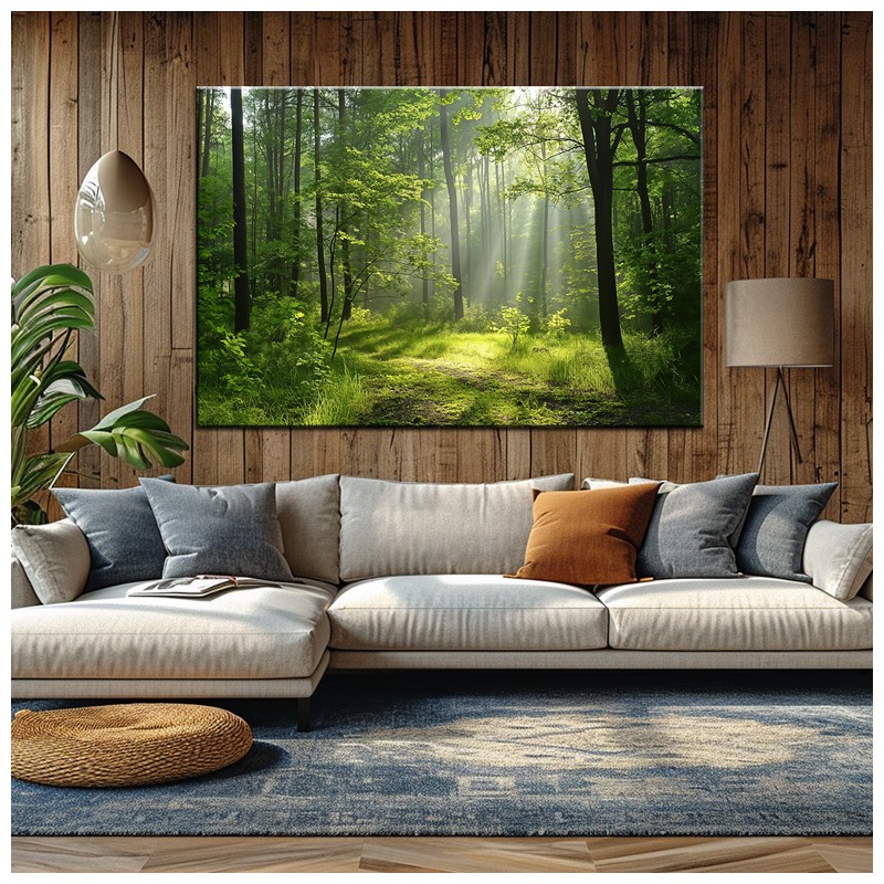 Ukojenie serca i radość życia z obrazem "Szept Lasu" na płótnie Canvas. Zarośnięty trakt prowadzący do serca puszczy tkany promieniami słońca. Doskonałe w kompozycji obrazy las zasłonięte mglistą kotarą powietrza, której szept brzmi hymnem spokoju.