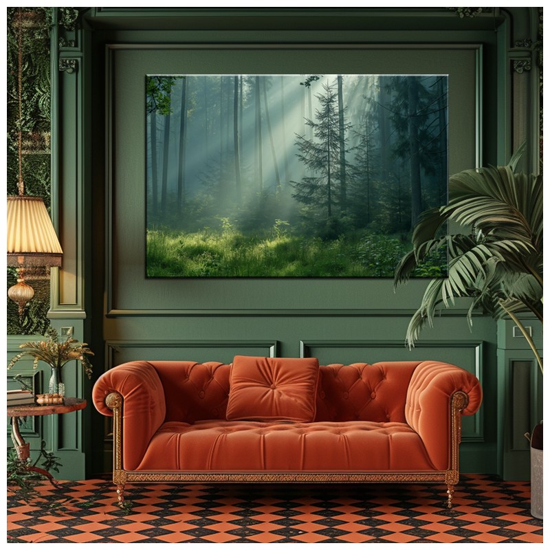 Piękny obraz "Zielony Las" do ozdobienia ściany. Wydrukowany na naturalnym płótnie Canvas - gotowy do powieszenia na ścianie. Zjawiskowo zielony obraz las, który odkryje harmonię w Twoim wnętrzu nadając jej więzi z naturą. Zachwycający pejzaż leśny z idealnie uchwyconymi promieniami światła przebijającymi się przez gęste drzewa.