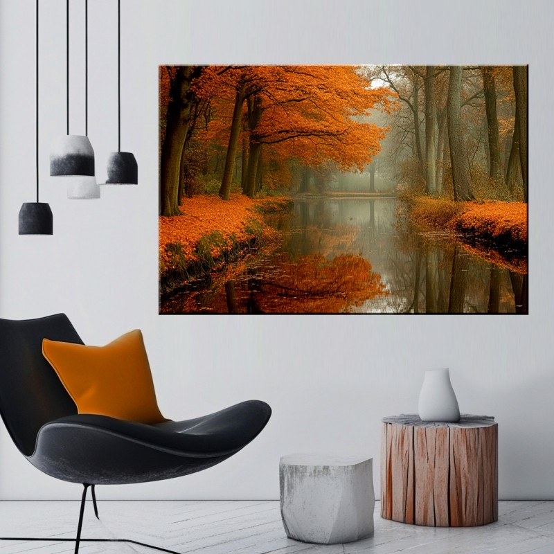 Obraz „Pomarańczowy Las Jesienią” zachwycająca pięknem jesiennego lasu przez który płynie rzeka. Intensywne, pomarańczowe liście tworzą ciepły kontrast z spokojną taflą wody, która odbija krajobraz niczym lustro. Delikatna mgła unosząca się w tle dodaje tajemniczości i głębi, podkreślając niezwykłą atmosferę tego miejsca.