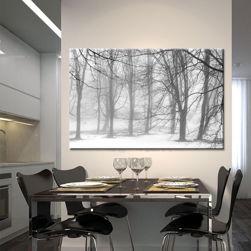 Zrównoważony kompozycyjnie obraz Las we Mgle drukowany na płótnie Canvas. Mgła oplatając gałęzie drzew, wprowadza ciszę i spokój. Poranek, który budzi do refleksji. Monochromatyczny krajobraz lasu, uchwycony okiem Piotra Raszewskiego. Obraz dostępny na wymiar.