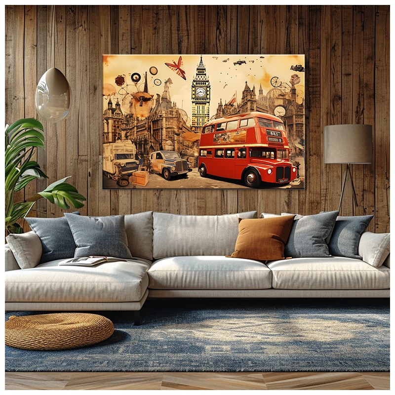 Piękny obraz Londyński Autobus, a w tle zabytki i atrybuty Wielkiej Brytanii. Drukowany na płótnie Canvas. Artystyczny kolaż komunikacji miejskiej Londynu w ciepłych kolorach brązu, beżu i czerwieni.