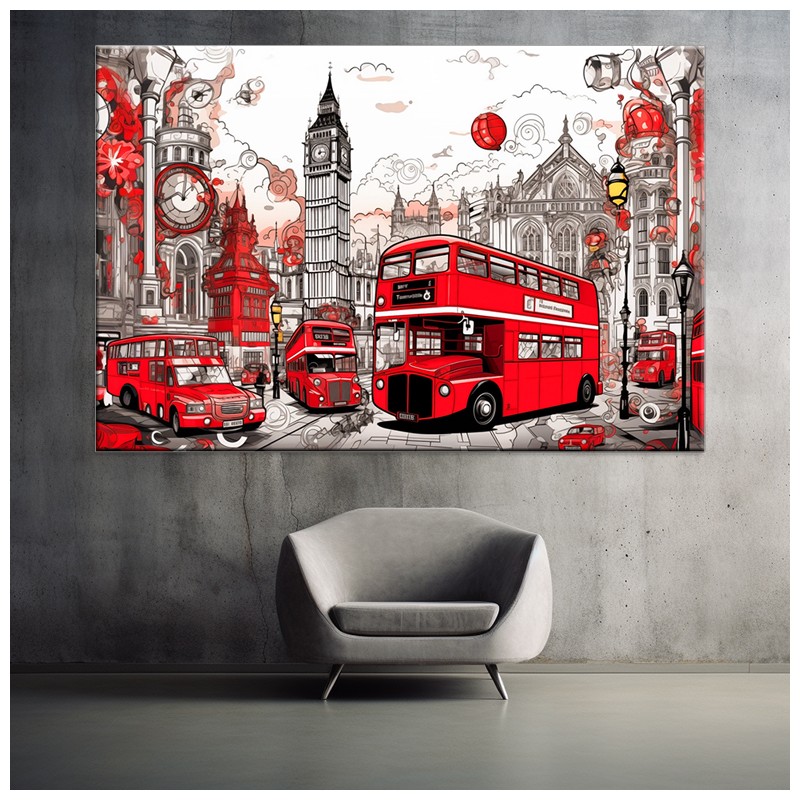 Intensywnie kolorowy obraz nowoczesny Londyn do udekorowania ściany. Piękna czerwień samochodów i detali architektonicznych współgra z szarym tłem ulicy i budynków. Artystyczny kolaż idealny dla miłośników Wielkiej Brytanii.