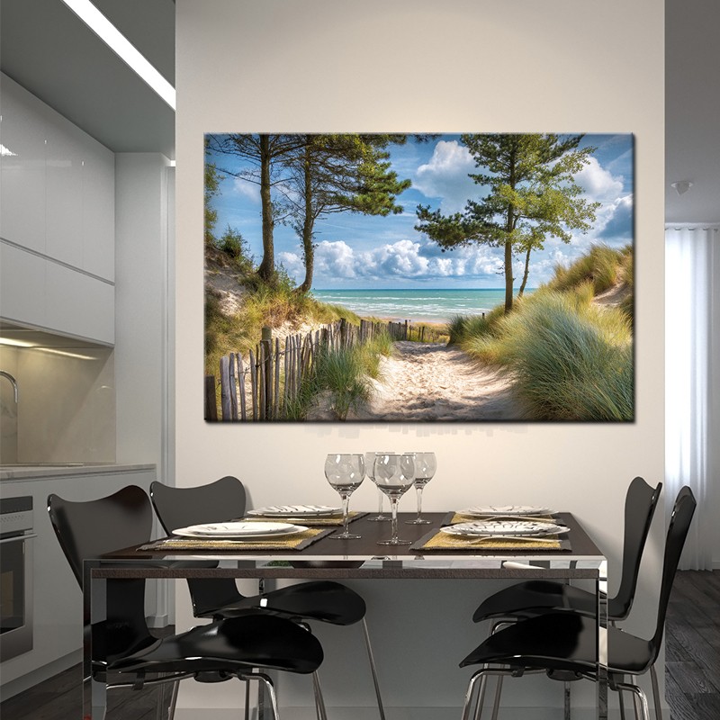Relaksacyny obraz "Zejście na Plażę Bałtyku" drukowany na płótnie Canvas. Piaszczyste wydmy łączy wąska ścieżka prowadząca na piaszczystą plaże. Sosny, trawy oraz spokojne fale tworzą pełen świeżości nadmorski pejzaż. Przestrzeń, światło i wiatr zamknięte w jednej, spokojnej kompozycji.