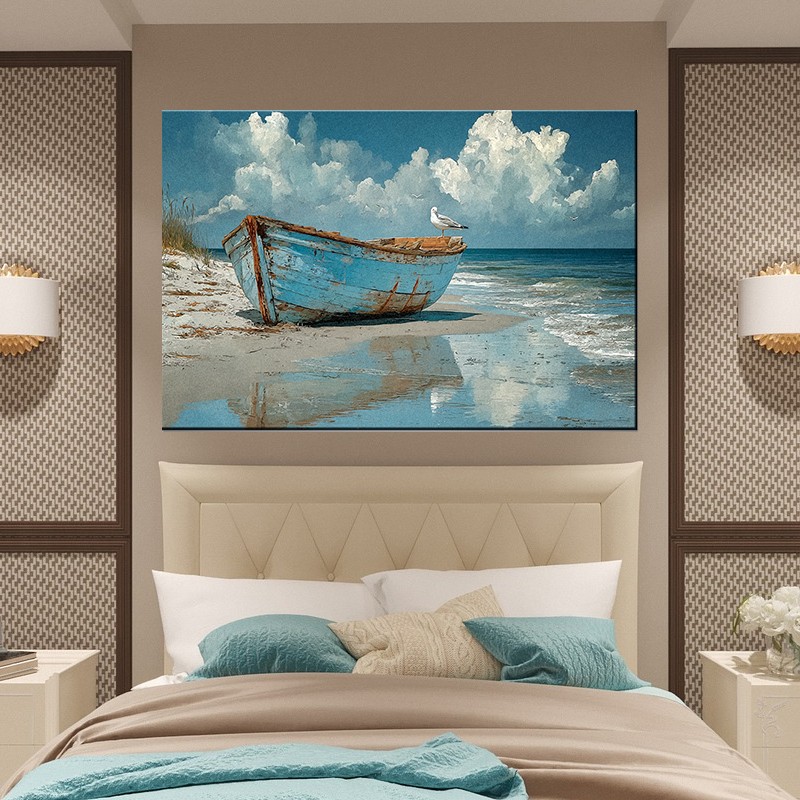Obraz "Stara Łódź na Plaży" w błękitach i bieli. Szum fal, refleksy na tafli spokojnego morza i mewa - strażnik ciszy. Obraz drukowany na płótnie w stylizacji malarstwa. Wydruk wykonany w technologii cyfrowej z dbałością o każdy detal.