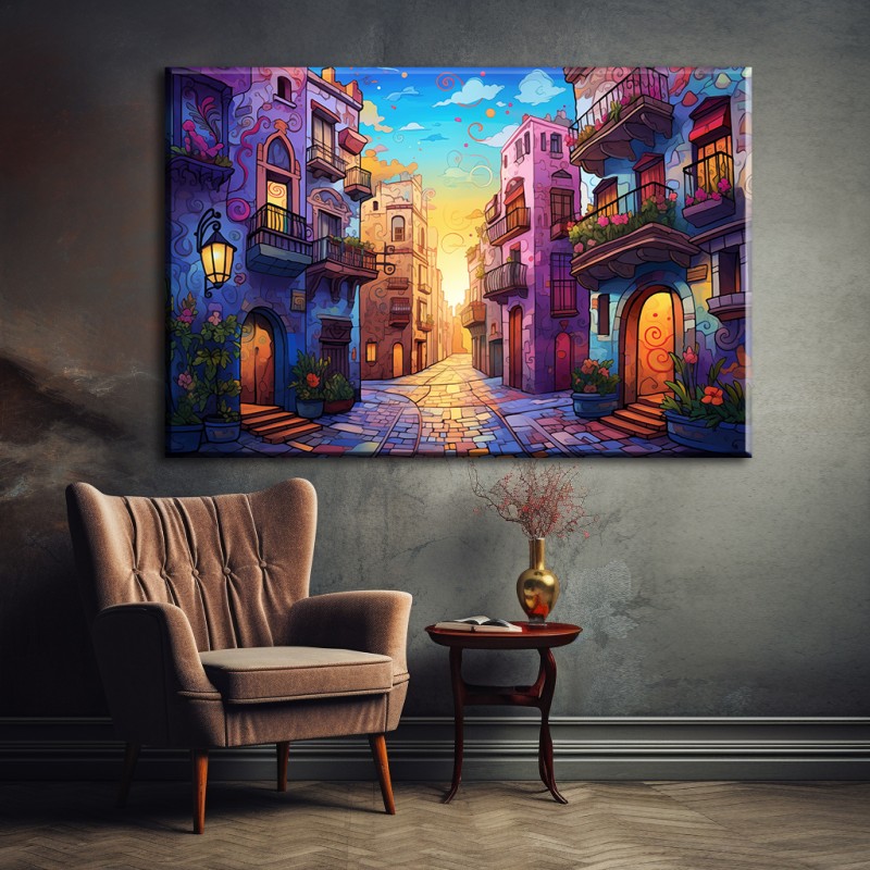 Ponadprzeciętnie kolorowy obraz Barcelona czerpiący ze stylu malarstwa Gaudiego. Ten drukowany na płótnie nowoczesny obraz przedstawia uliczkę w Barcelonie. Nasycone kolory fasad budynków w dominujących barwach fioletu i różu.