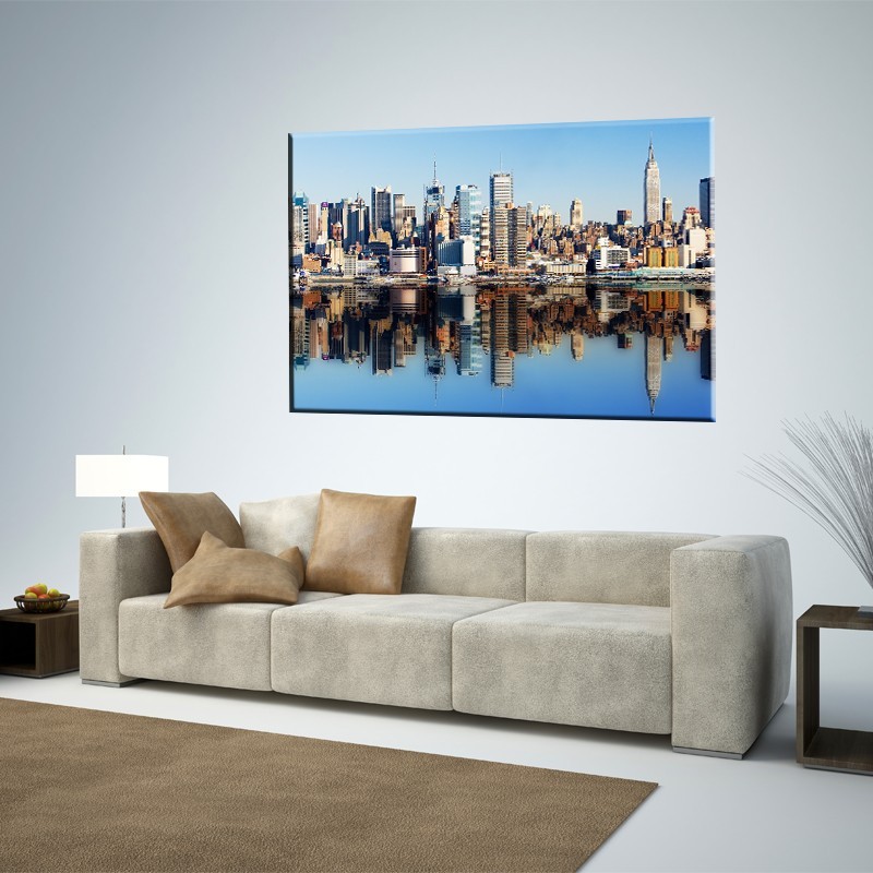 Niezwykły obraz przedstawiający panoramę nowoczesnej metropolii, jednakże z niezwykle interesującym lustrzanym odbiciem w tafli gładkiej niczym stół rzece. Jest to dość często wykorzystywany styl, który pomimo to wciąż jest bardzo popularny. Dzięki realistycznej kolorystyce dekoracja ta idealnie nadaje się do salonu jak i przedpokoju. Znacznie więcej równie wspaniałych wzorów o podobnej i nieco odmiennej tematyce znaleźć można w kategorii architektura.