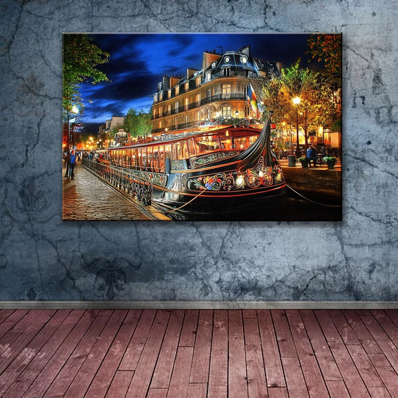 Wieczór nad Sekwaną na obrazie "Paryska Noc na Barce", gdzie światła latarni i zdobiona barka przycumowana w sercu miasta. Obraz z intensywnym kolorem i klimatem nocy. Fasady kamienic świecą ciepłym światłem oddychając wielowiekową tradycją kultury i sztuki. Obraz drukowany na naturalnym płótnie Canvas.