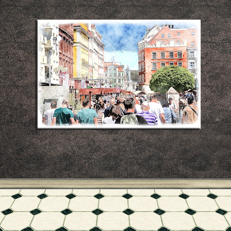 Obraz na płótnie z jarmarkiem we Wrocławiu. Tłum spacerujących i czerwone daszki jarmarcznych budek, a w oddali fasady kamienic wrocławskiego Rynku. Piękna, drukowana na płótnie reprodukcja akwareli. Galeria Agaton Studio zaprasza po obrazy na płótnie Wrocław z realistycznymi reprodukcjami malarstwa. Obraz Zamówisz on-line lub telefonicznie.