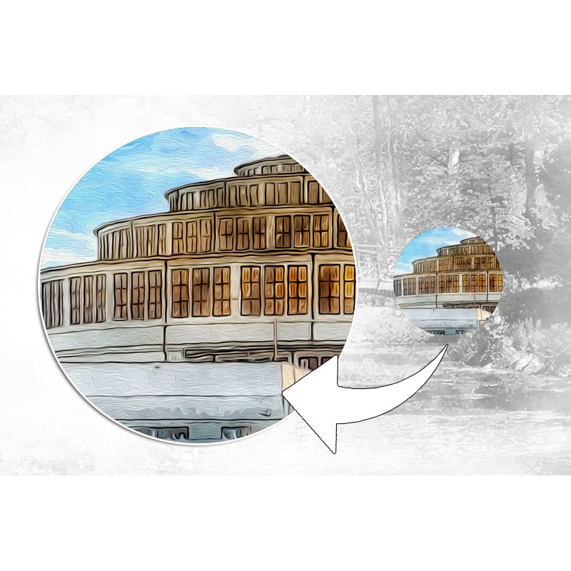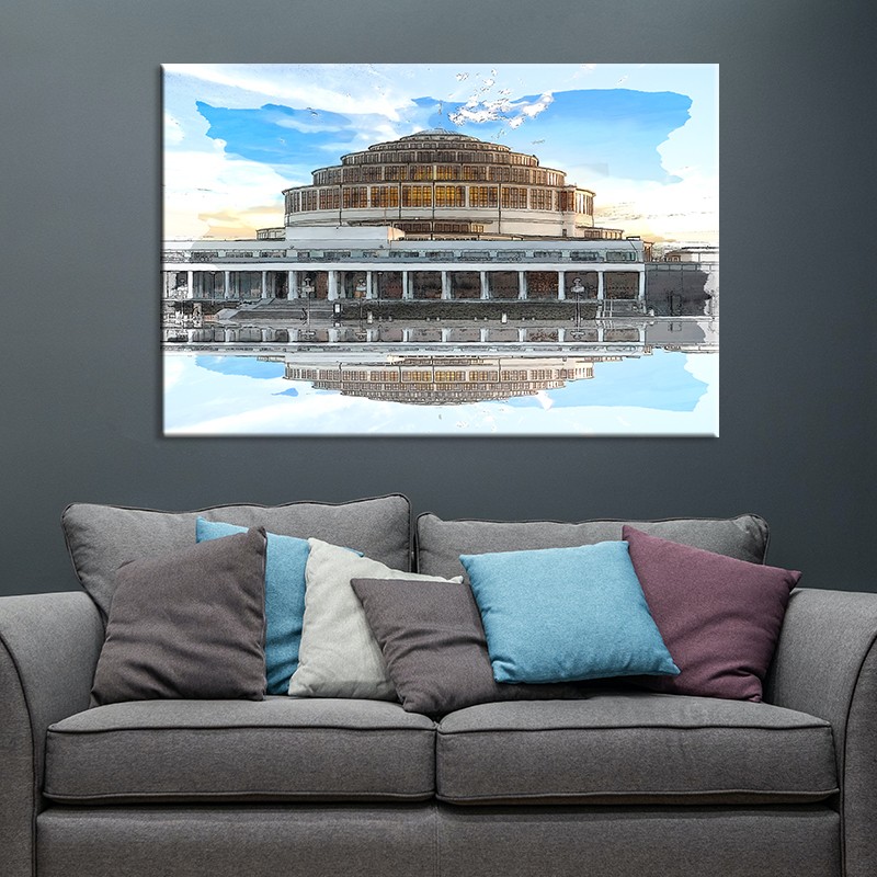 Drukowany na naturalnym płótnie obraz Hala Stulecia Wrocław w reprodukcji malarstwa. Artystyczna koncepcja Hali Stulecia z jej odbiciem w wodzie. Bajkowa sceneria z galerii obrazy Wrocław, którą udekorujesz przestrzeń mieszkalną lub użyteczności publicznej. Zwróć uwagę na fragment obrazu w powiększeniu. Obraz zamówisz również telefonicznie.