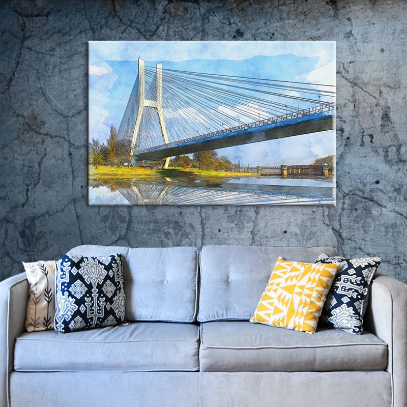 Wydrukowany na naturalnym płótnie Canvas Roma, obraz most Rędziński we Wrocławiu z nutą artyzmu upiększy Twoje wnętrze. Piękna i kolorowa reprodukcja malarstwa drukowana z wyjątkową starannością i dbałością o szczegóły. W głębi obrazu z mostem Rędzińskim, widoczny Jaz Rędzin na Odrze. Reprodukcja pochodzi z galerii obrazy Wrocław na płótnie od Agaton Studio.