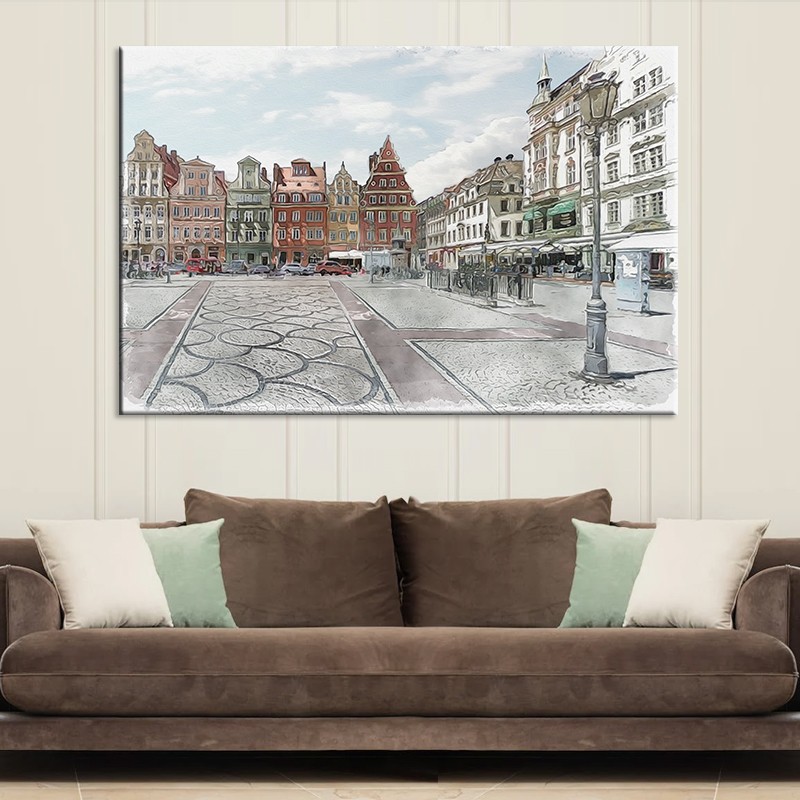 Obraz na płótnie Plac Solny Wrocław z widokiem na kamienice wschodniej pierzei. Urzekająca kompozycja charakterystycznego miejsca we Wrocławiu. Drukowana na płótnie reprodukcja malarstwa powiązana z Wrocławiem. Sprawdź zdjęcie z fragmentem obrazu w powiększeniu. Więcej dekoracji znajdziesz w galerii obrazy Wrocław na płótnie od Agaton Studio.