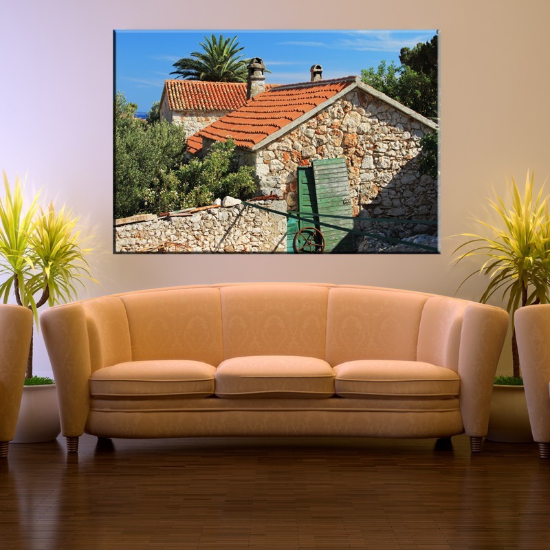 Obraz z budynkami zbudowanymi jedynie z kamieni i zaprawy, widok dopełniają dodatkowo dachy wykonane z pomarańczowej dachówki. Drzewa porastające posesje pozwalają domyślić się iż miejsce to położone jest w cieplejszych krajach w pobliżu morza, lub oceanu. Taka dekoracja doskonale nadaje się do ozdobienia wnętrza salonu, sypialni, oraz przedpokoju, gdzie jej pozytywny wpływ będzie największy. Więcej równie wspaniałych dzieł znaleźć można w kategorii architektura.